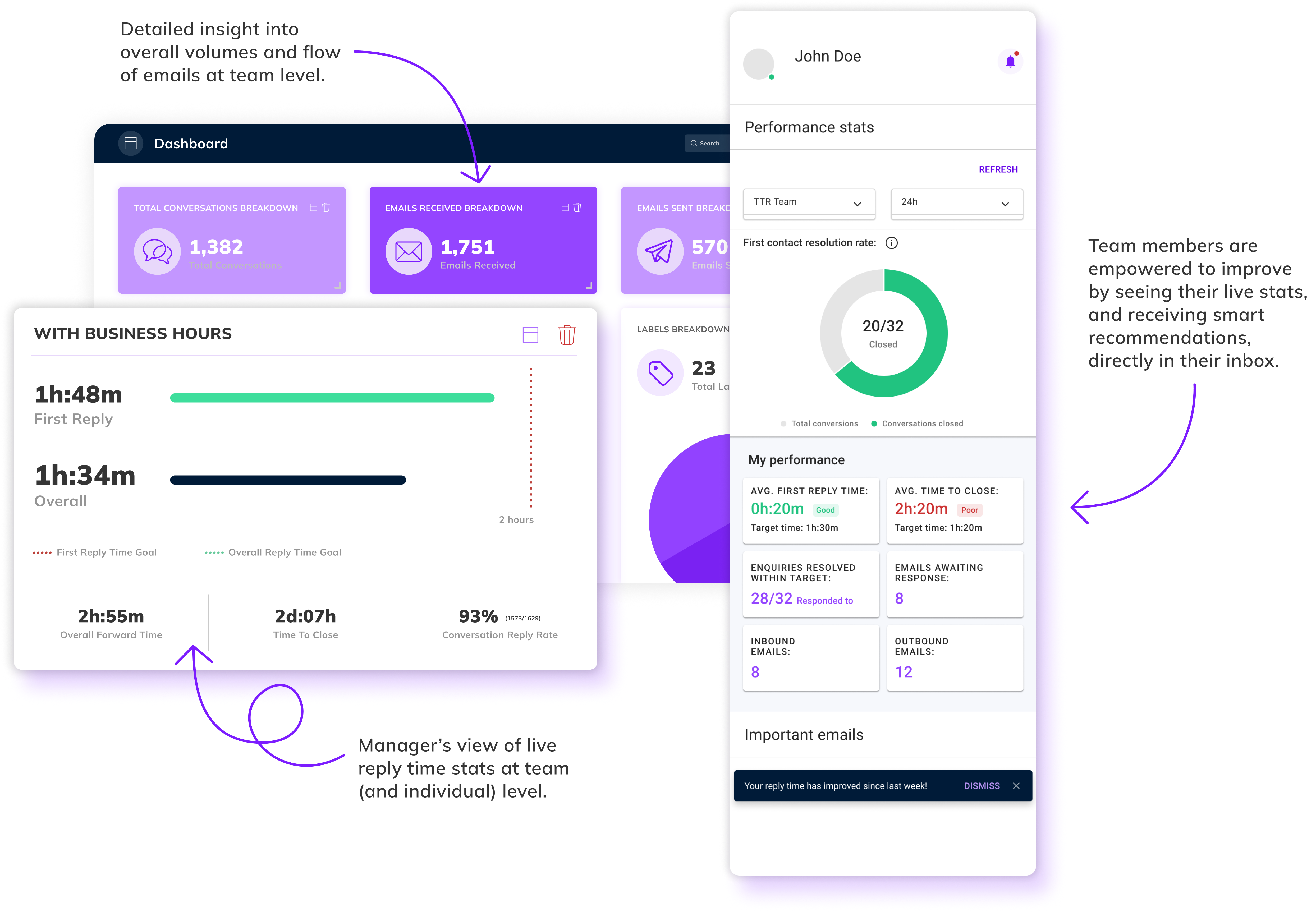 Get comprehensive reports into every one of your customer service emails and keep your team on track to hit all their goals.