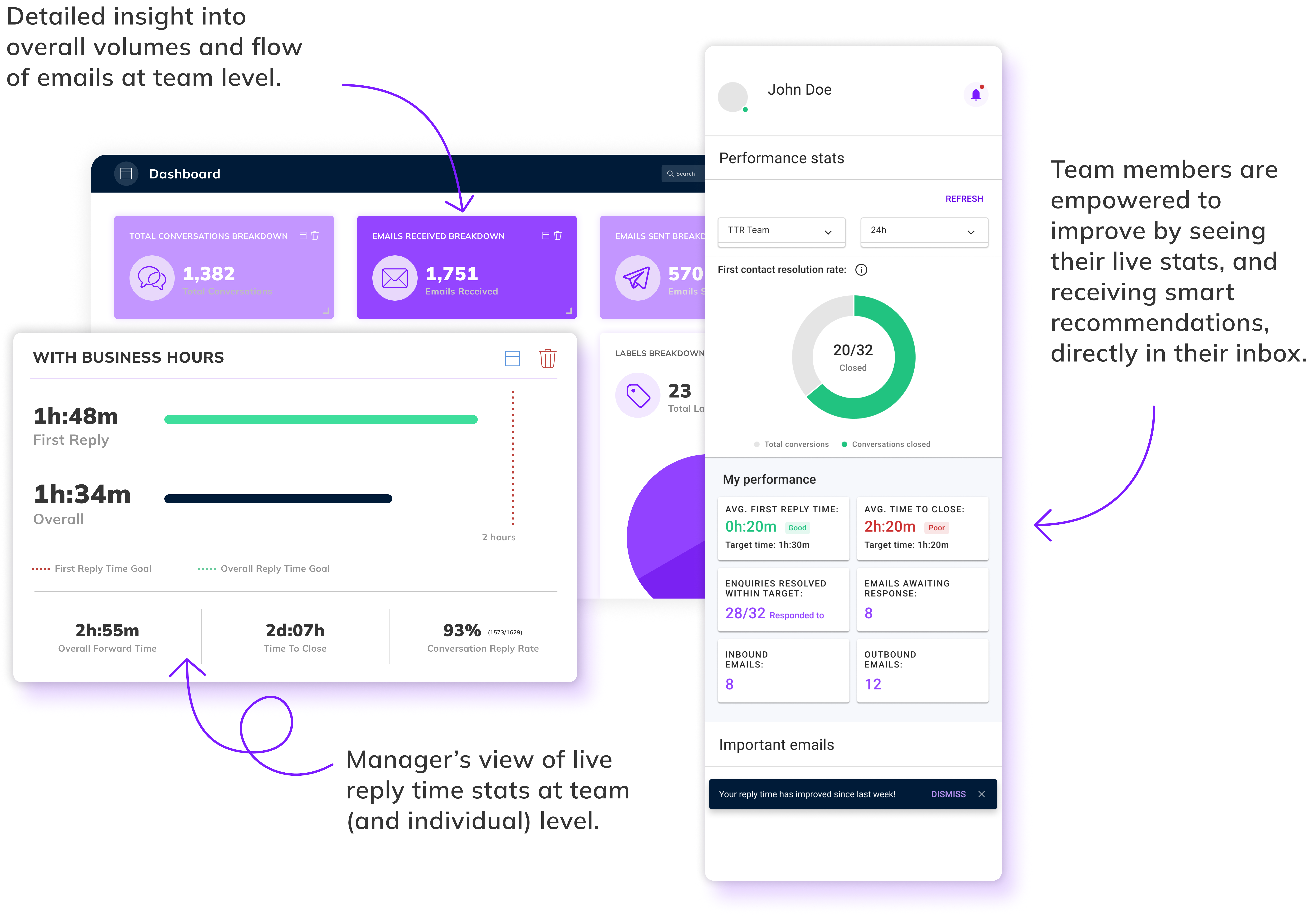 With timetoreply’s email analytics solution for customer teams, agents are free to use their Gmail and Outlook emails as per usual and team leaders and managers can easily get all the reports in the backend without having to migrate anyone to a new way of working.
